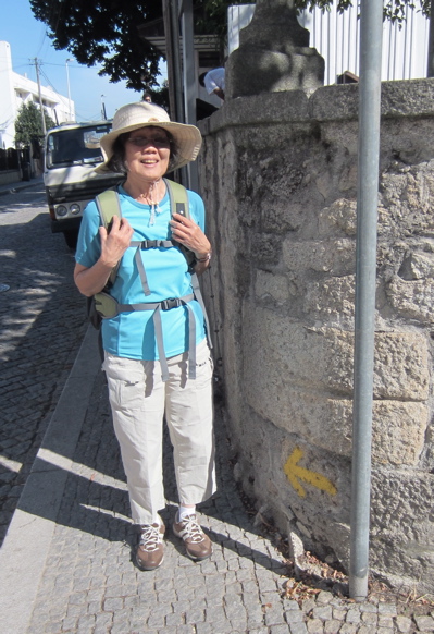 Near Maia church, Emmy was the first to spot one of the Camino´s famous yellow arrows (on the wall beside her knee)