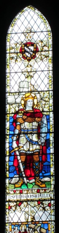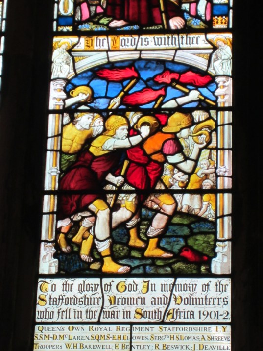 In Carlisle Cathedral, St.Oswald appears in full battle armour carrying an enormous sword with a halo of Christian piety crowning his head. In Lichfield Cathedral a colourful stained glass window is dedicated to the memory of a certain Sir Horiatio Page Vance who fought at the sieges of Sevastopol in the Crimea (1854-1855) and Lucknow in India (1857). It depicts British sappers, complete with a large shovel, undertaking a siege some time in the Middle Ages. In St.Mary’s Church, Painswick, a model sailing boat is attached to the wall. Beside it a plaque likens the Christian Church to a boat, then draws a parallel between the boat of Christianity and a battleship of sixteenth century England that saw action against the Spanish Armada.