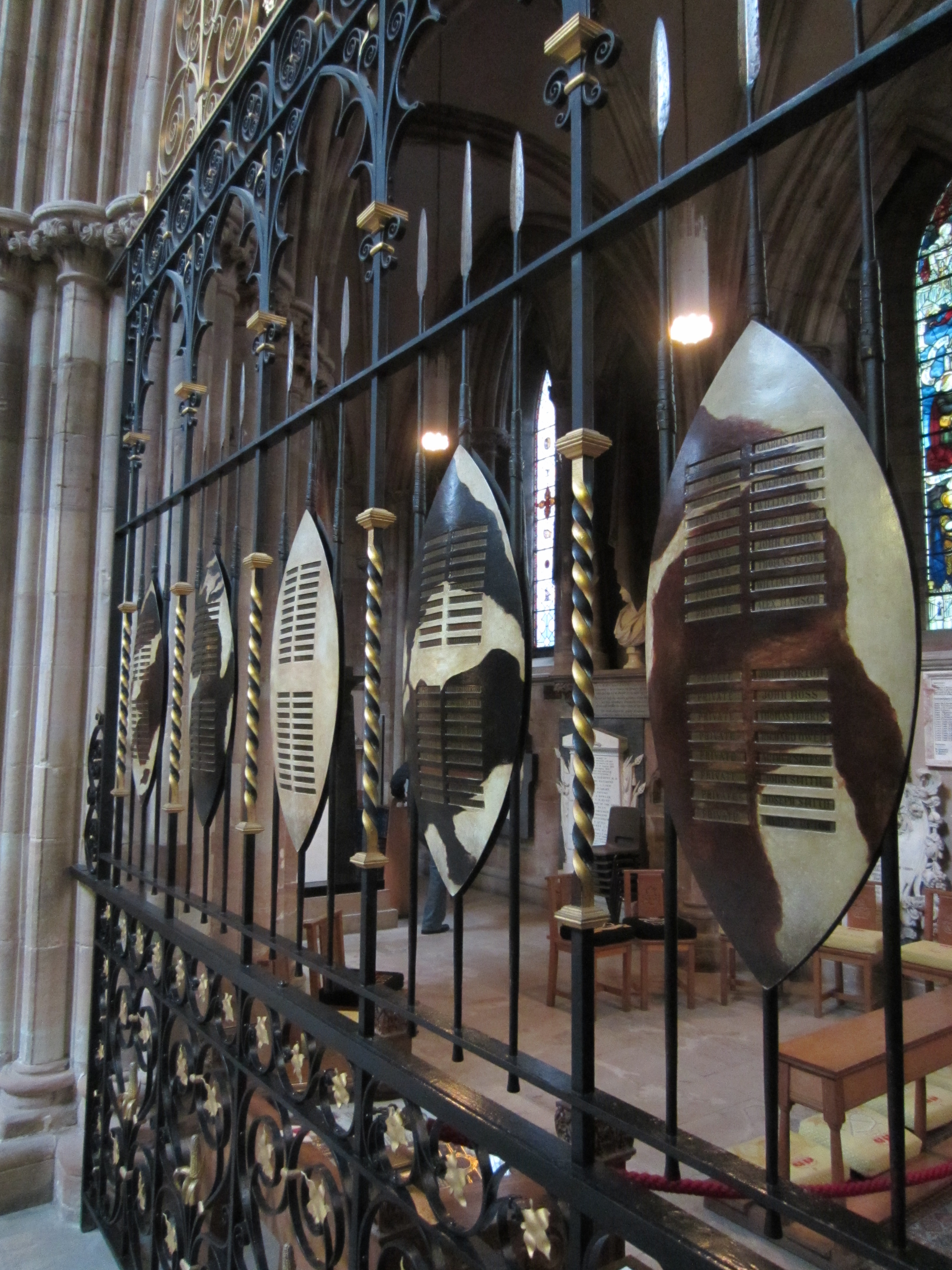 It would be a consolation if I could report that the images I saw only commemorated those who died resisting aggression by the enemies of freedom and peace. But I was struck by the many images – probably a majority – that commemorate Britain’s wars of aggression in distant lands. One of the most shocking is to be seen in Lichfield Cathedral. In one corner of the cathedral there is a prominent memorial to those who died during Britain’s wars of conquest against the Zulu people of South Africa (1878-1879). The memorial takes the form of a palisade of Zulu spears and shields – stylised war trophies, in effect. The names of the soldiers who died are inscribed on the shields.