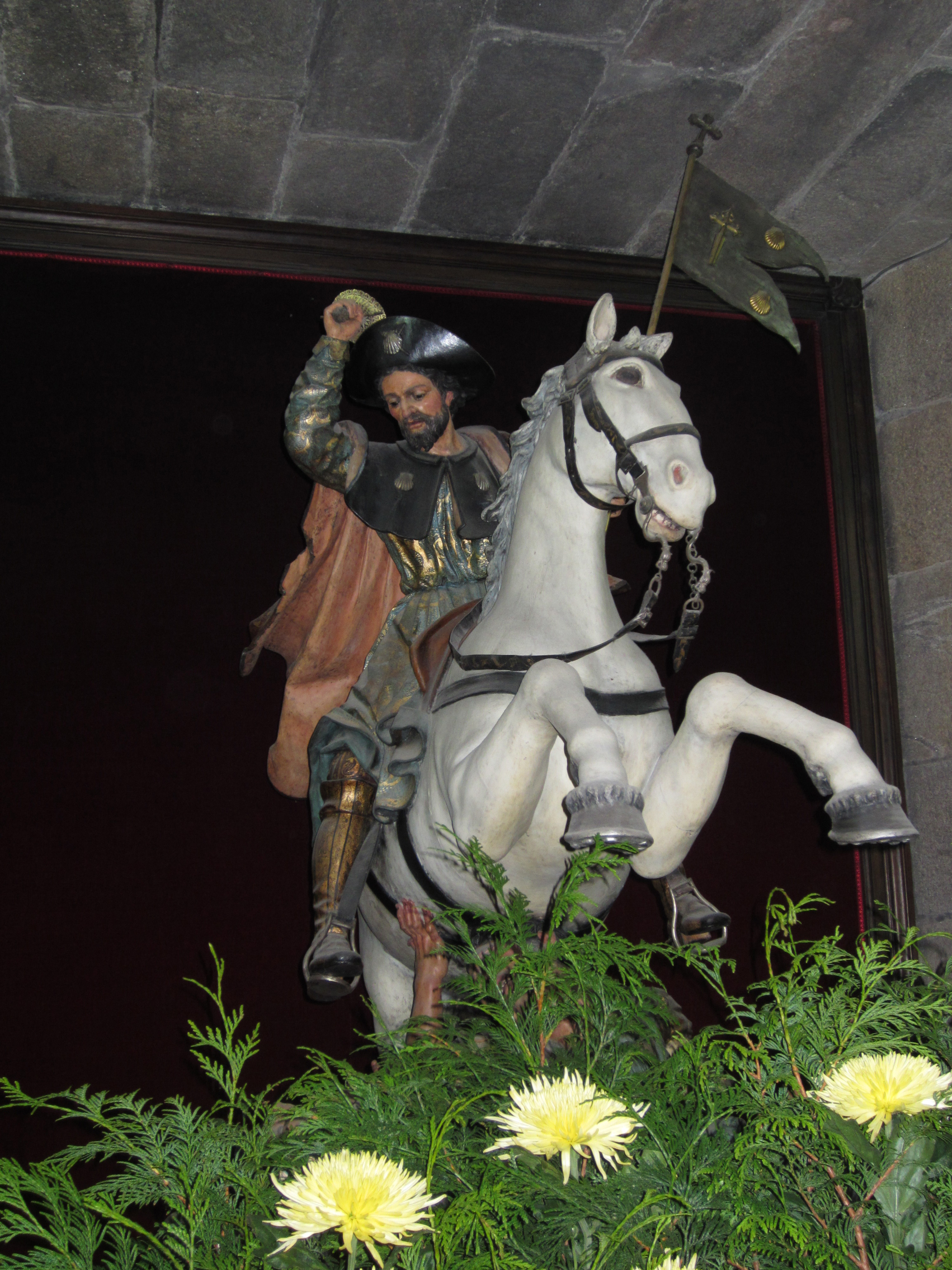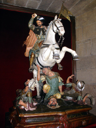 There is a dramatic effigy in a niche in the Cathedral of St.James in Santiago de Compostela. It depicts St.James in medieval military garb astride a horse, brandishing a sword above his head. Legend has it that St.James – Santiago – appeared to Christian troops during the semi-legendary Battle of Clavijo in 844 in which Spanish Christians defeated a much bigger Muslim army. During the following seven centuries of conflict between Christians and Muslims in the Iberian peninsula – from roughly 800 until 1492 – Santiago was adopted as the divine mentor of the Christian forces. He was given the name Matamoros, “Killer of Moors” i.e. killer of Muslims, and subsequently became the patron saint of Spain. “Santiago y cierra, España!” (St. James and attack, for Spain!) became the battle cry of Spanish armies as they slowly recovered the Iberian peninsula from its Moorish rulers. The cry persisted into modern times and was frequently used as a nationalistic slogan during Franco’s long years of Fascist rule.