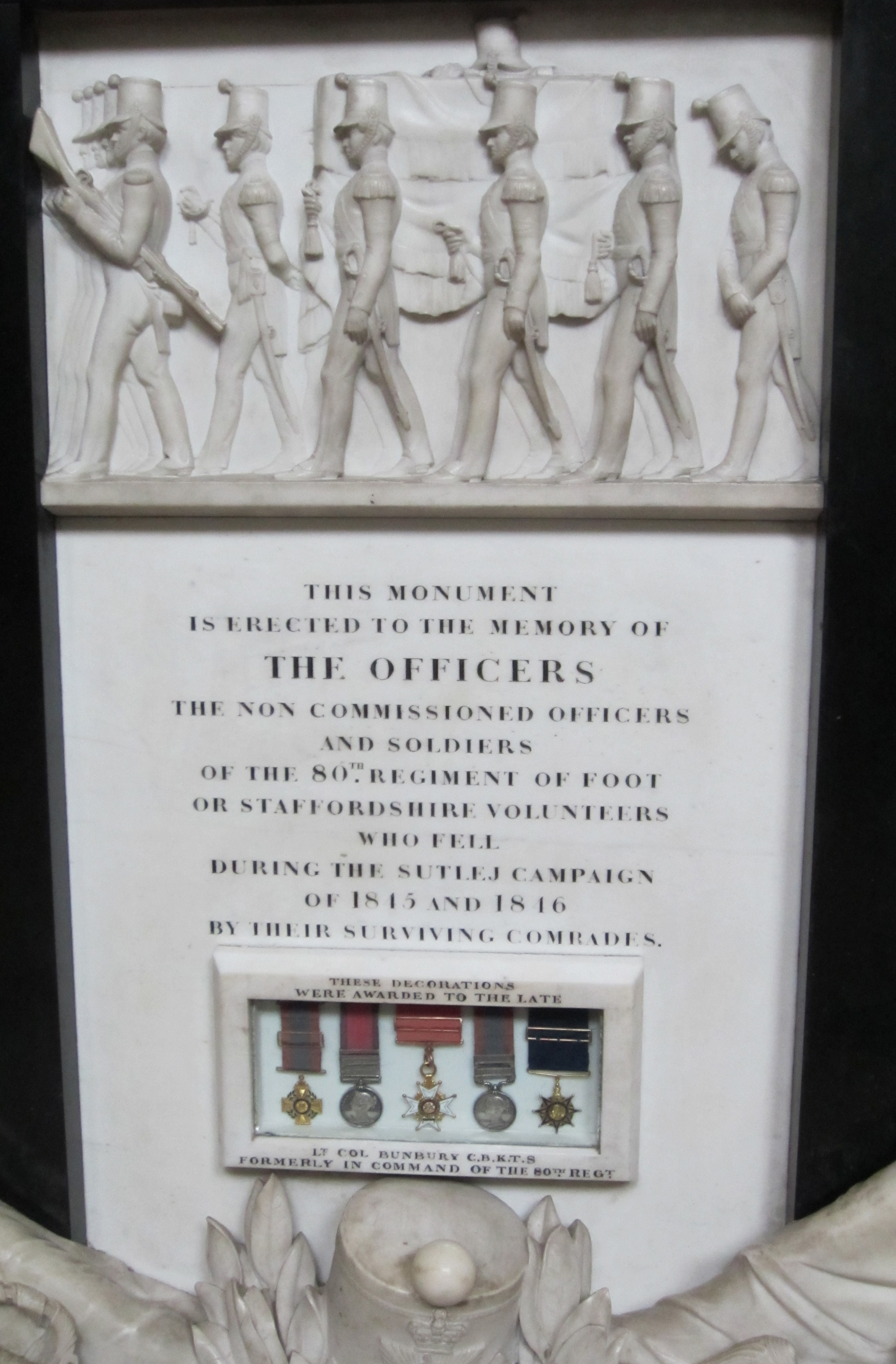 Also in Lichfield Cathedral there is a memorial to members of the local Staffordshire Regiment who died during the first Anglo-Sikh War (1845-1846) in India, also known as the Sutlej Campaign. The brutal Sutlej Campaign was the very first for which medals were issued with metal bars or clasps that could be attached to a medal’s ribbon. In a bizarre touch, some of this purely military memorabilia is displayed in the “holy” precincts of the cathedral.