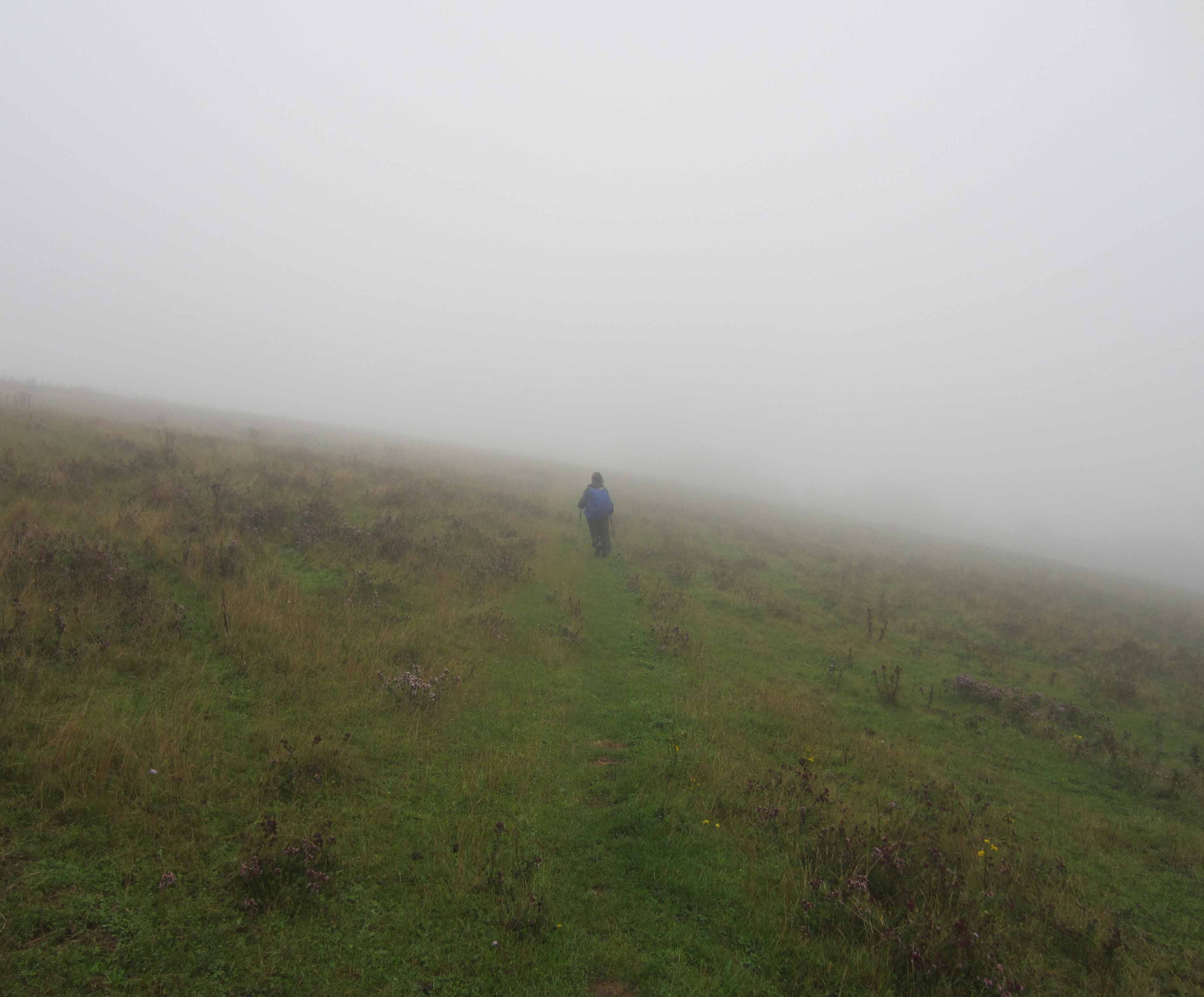 An hour later I was cursing Geoffrey Chaucer, the madness of religious pilgrimage and the sheer unpleasantness of walking in Britain’s summer. I skidded down a mud-lubricated trough that someone – probably a bright-eyed hiking fanatic – had labelled a “path”. A path? It was a water-filled rut. Thick slimy hamburger-patties of dirt stuck themselves to the bottom of my boots as the “path” made vertical zig-zags over steep rain-sodden ridges. I looked at Emmy and noticed a film of mud creeping up her water-proof leggings. I was no better. An unscheduled wallow in a mini-bog had left dirt all over my leggings, backpack, and even through my hair. Already I sensed I was in for one of the most trying days of walking I would ever experience.