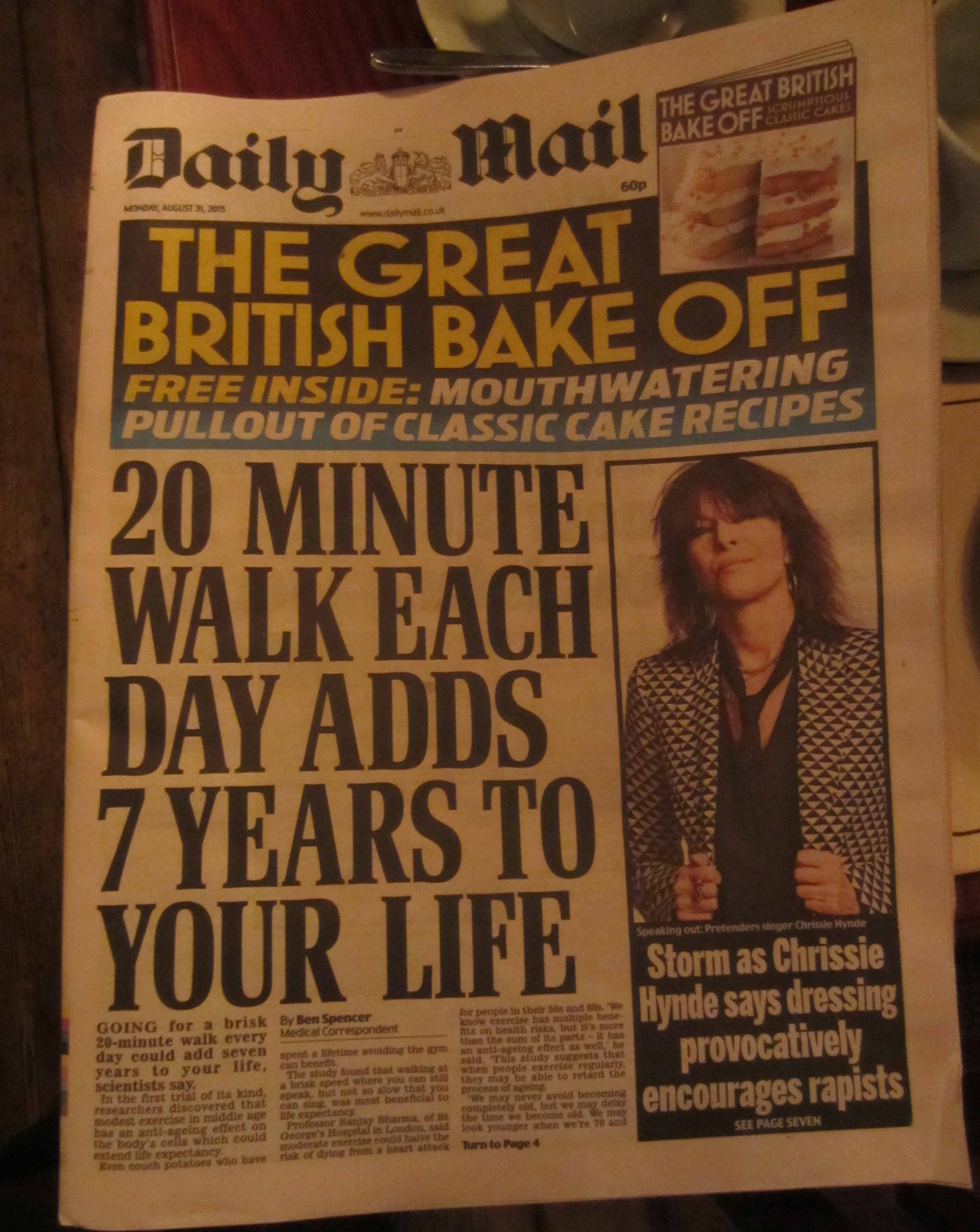 Nevertheless it was a long, tough day. As we trudged into the Bowl Hill Inn outside the town of Charing more than six hours had passed with just seventeen kilometres to show for it. In the bar the day’s newspaper lay draped across a stool. A jumbo-size headline on the front page proclaimed “Twenty minute walk each day adds seven years to your life.”
