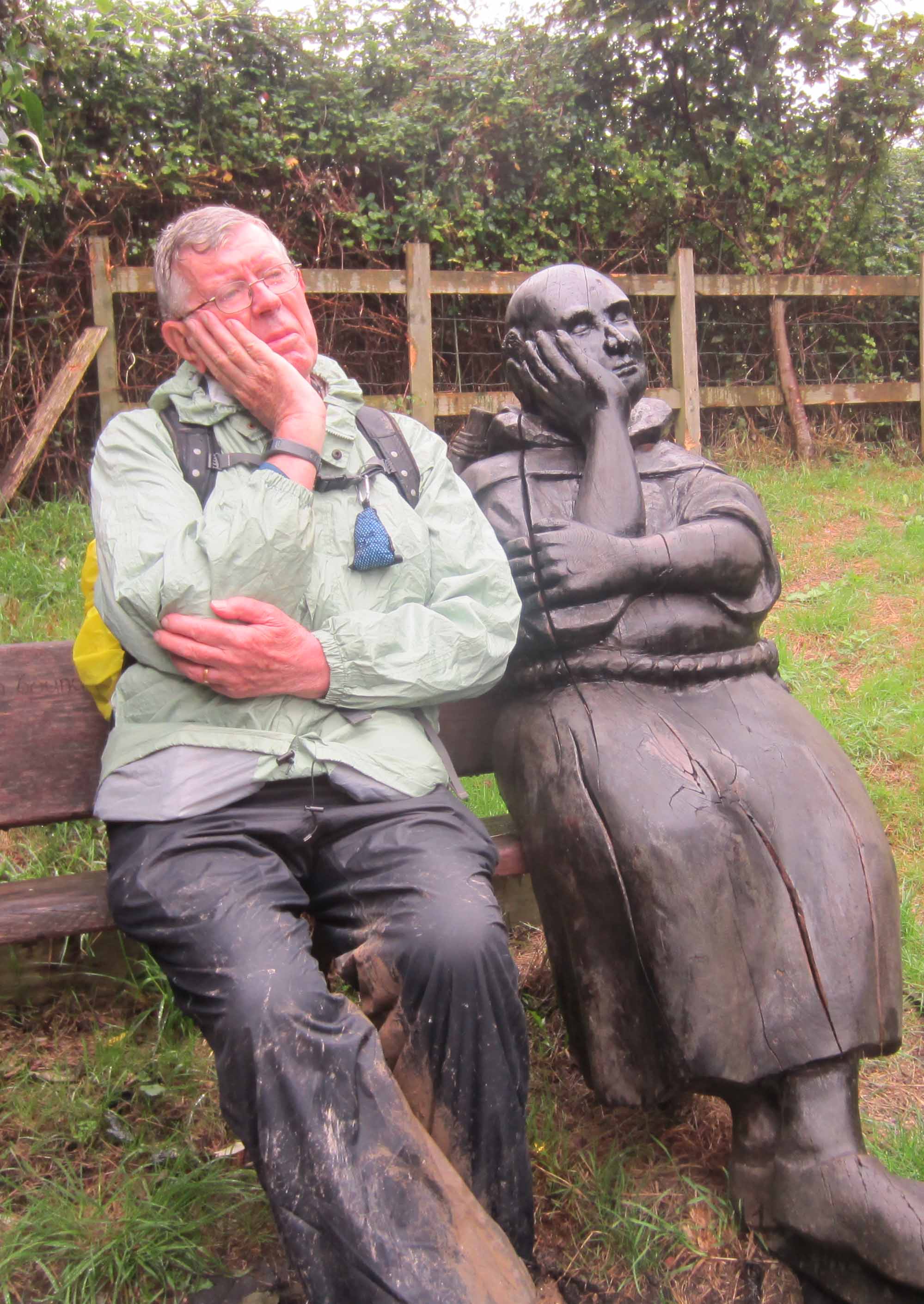 Everywhere there were reminders of the region’s pilgrim history. Some trackside icons pointing the way to Canterbury depicted a pilgrim wearing a cassock and brandishing a walking staff. Near the village of Harrietsham we came across a whimsical, life-size wooden carving of a pilgrim monk resting thoughtfully on a bench at the trackside. Medieval pilgrimage was a motif at the Black Horse Inn, our accommodation for the night in the hamlet of Thurnham about twenty-two kilometres from Cuxton. The inn’s cramped central room with its low ceilings, open fire-place, awkward nooks and crannies and crooked age-blackened beams was built in the thirteenth century. Dense strings of dried hops hung from the ceiling, a traditional decoration that is renewed from year to year. Perhaps medieval pilgrims in their grimy cassocks and straw-padded sandals had ducked their heads beneath this same bushy canopy.