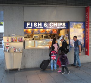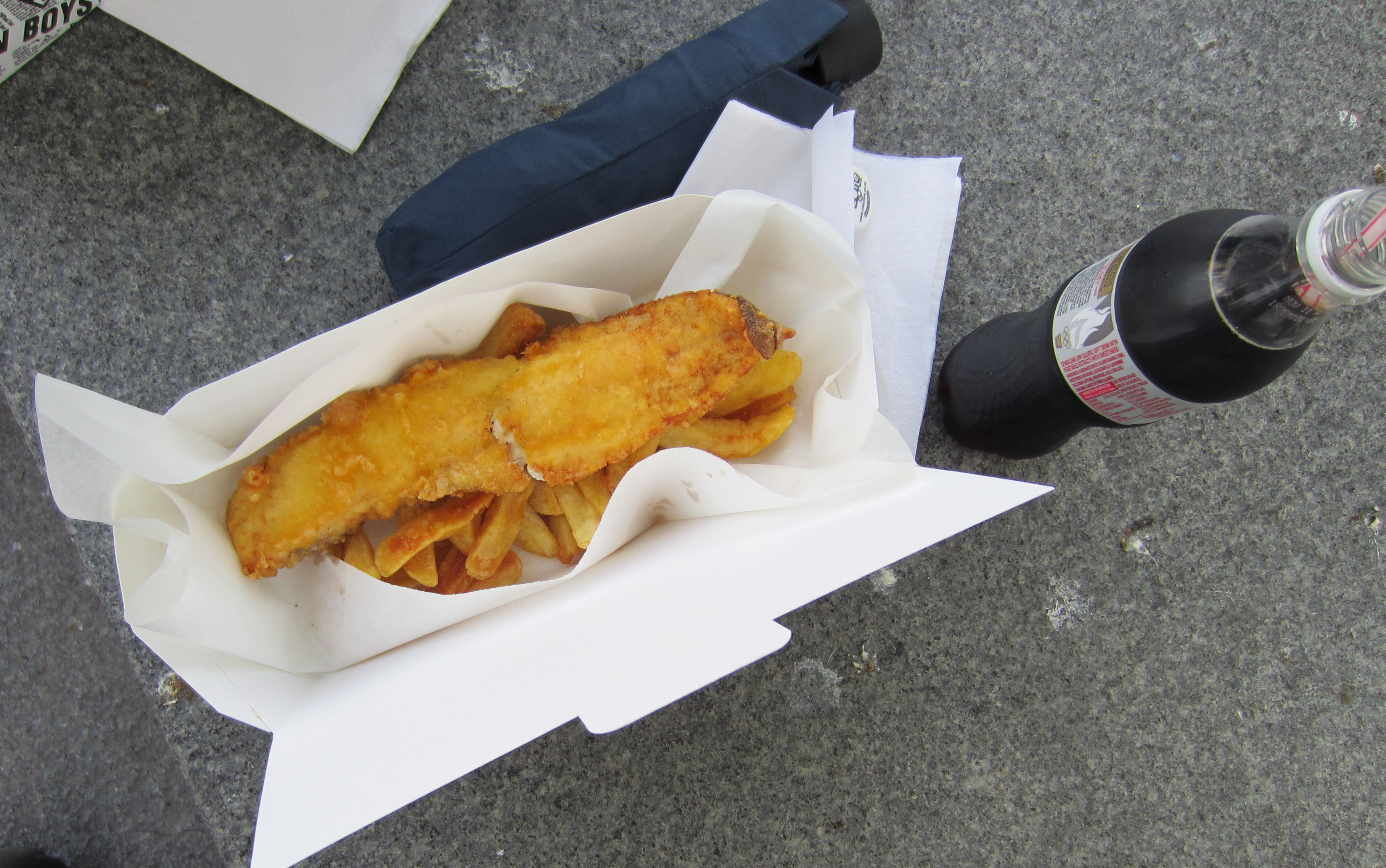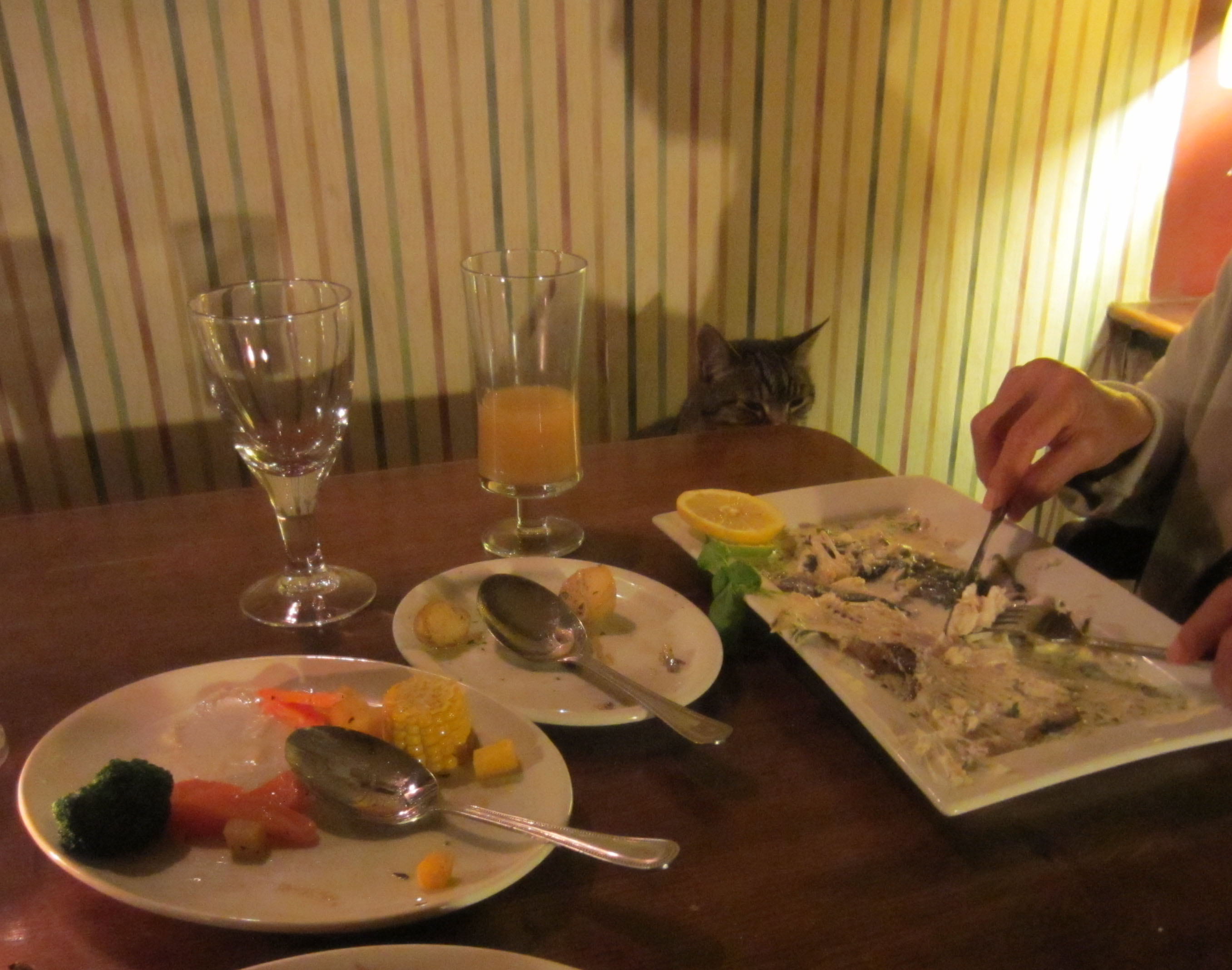 Fifteen minutes later the fish and vegetables arrived, but no soup. The restaurant staff were standing around the TV their backs to us.