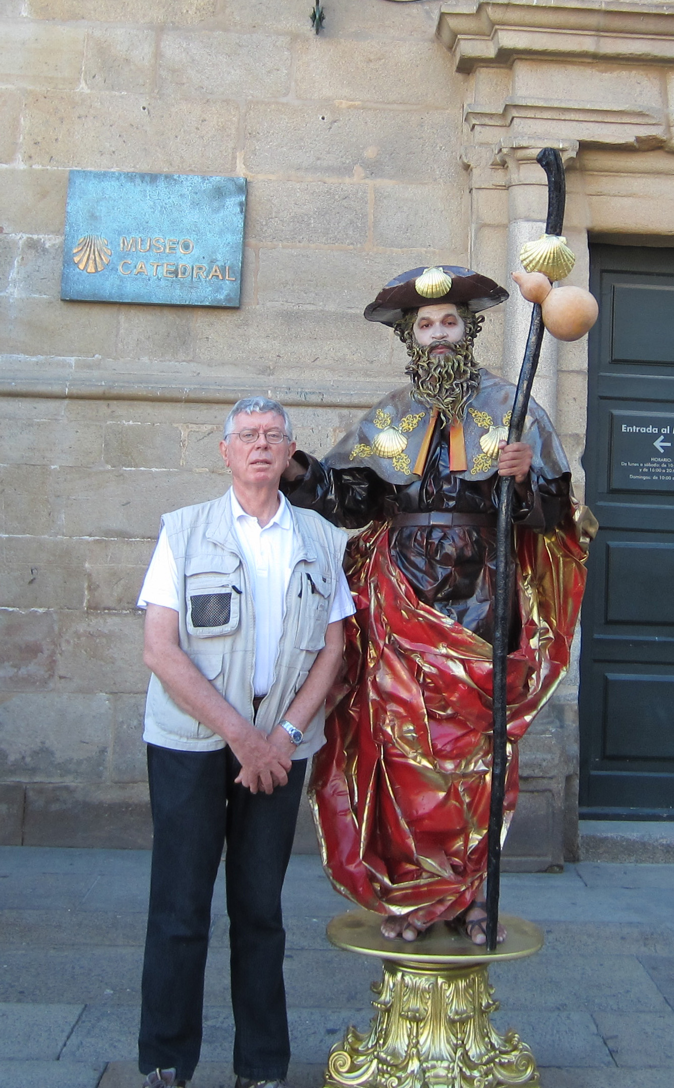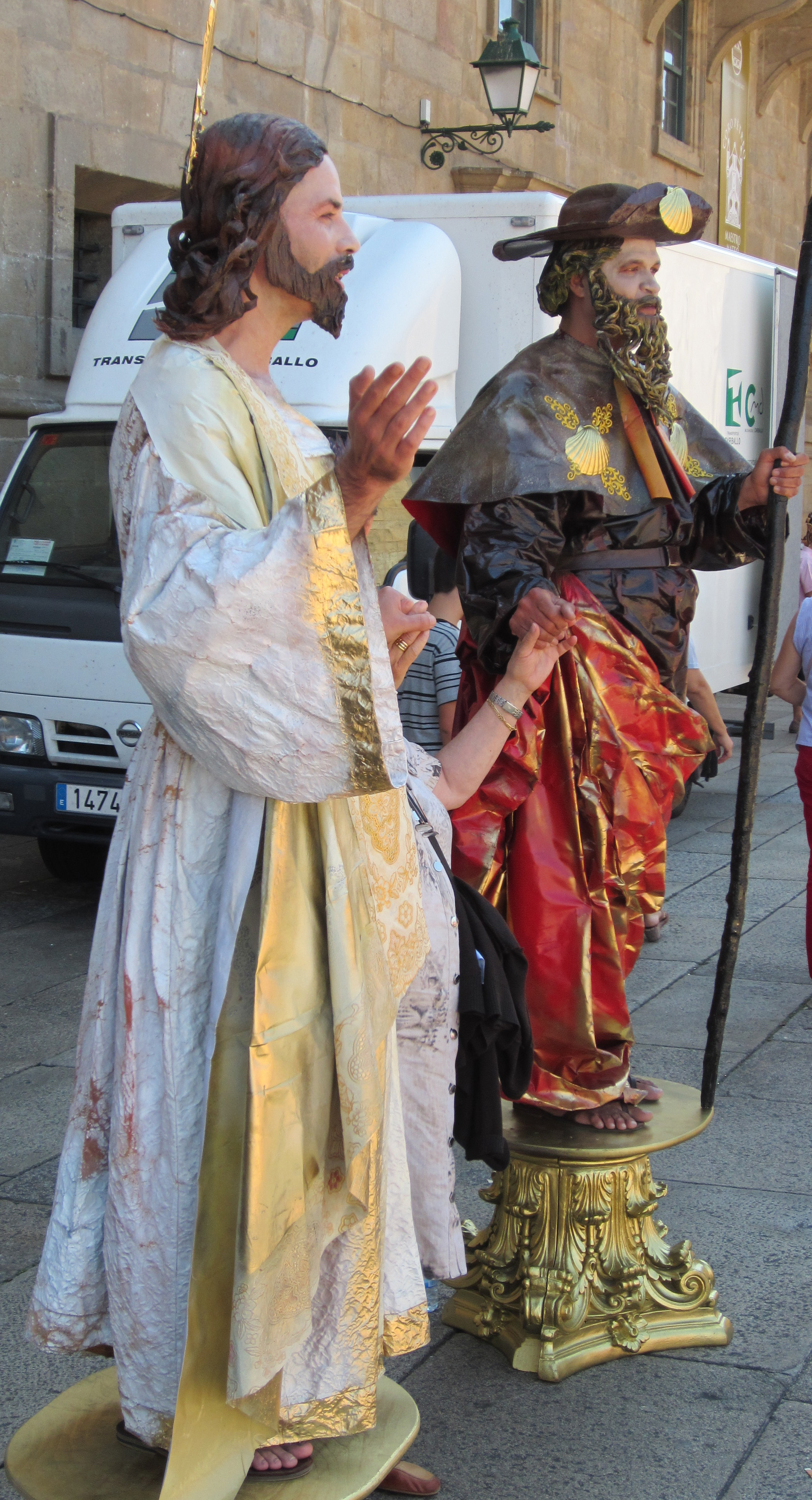 In the Praza do Obradoiro, the main square in front of the Cathedral of Santiago de Compostela, there are plenty of opportunities for pilgrims to part with their cash. For example, for a small “donation”, you can have your picture taken standing beside a meticulously costumed live figure of St.James. Even better, right beside him, Jesus Christ himself is waiting to be photographed (see pix).
