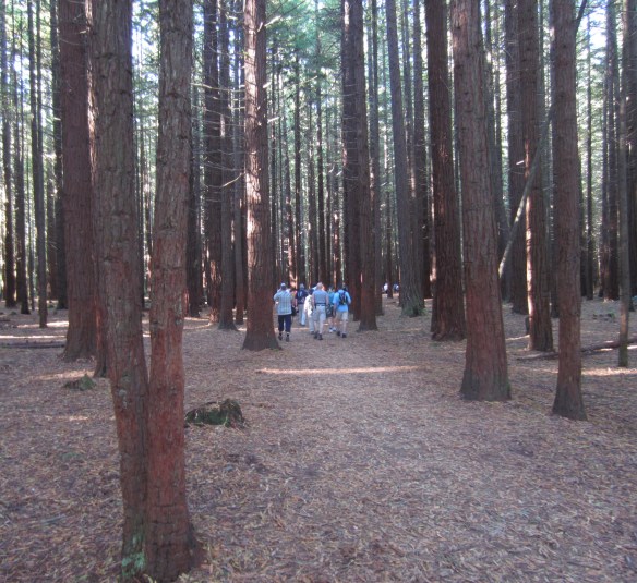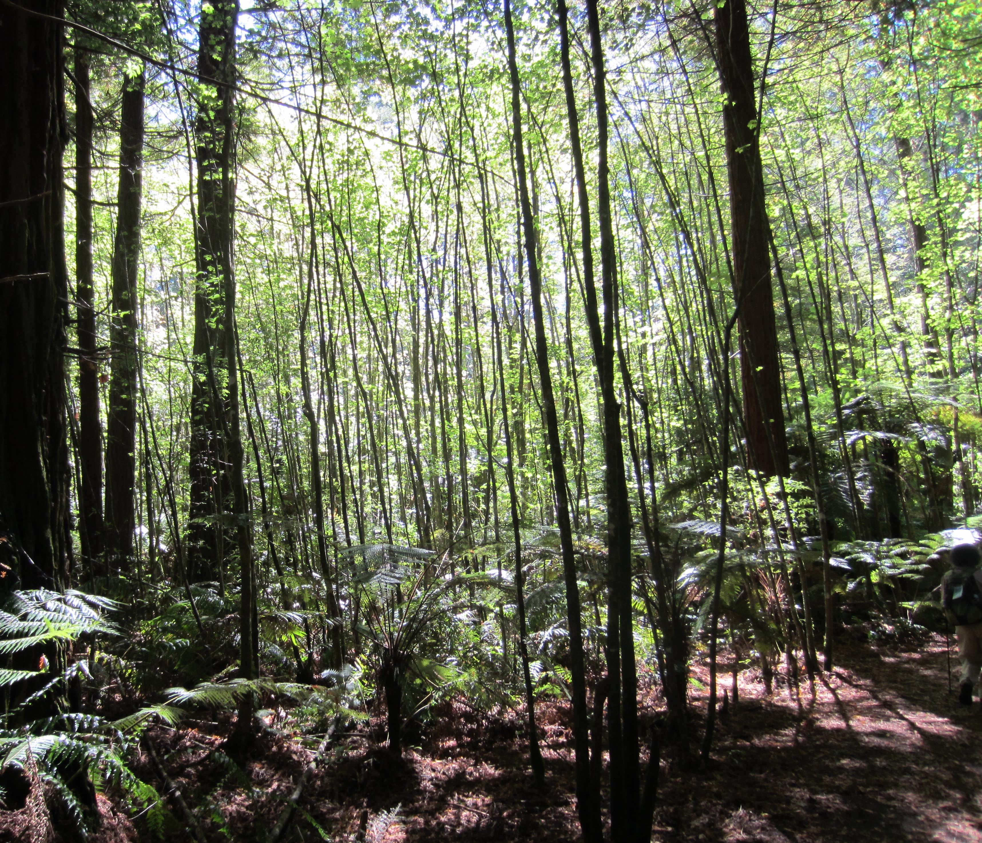 The track is well defined and the walking is easy, often over a soft mat of pine needles and manuka debris. There are several good inclines that will push air loudly in and out of your lungs and fill your ears with the thumping of blood. As we walked, we savoured the mild scent of manuka, and later – as the day warmed – the faint, refreshing perfume of pine. Tunnels of shade – busy with the zizz of a thousand insects – alternated with sections flanked with grass or beaten earth basking in yellow sunlight. Big black cicadas buzzed out of the trees and blundered into us, their wings fluttering momentarily in our ears or beating on our hats. In places they lay dead or fluttering on the path.
