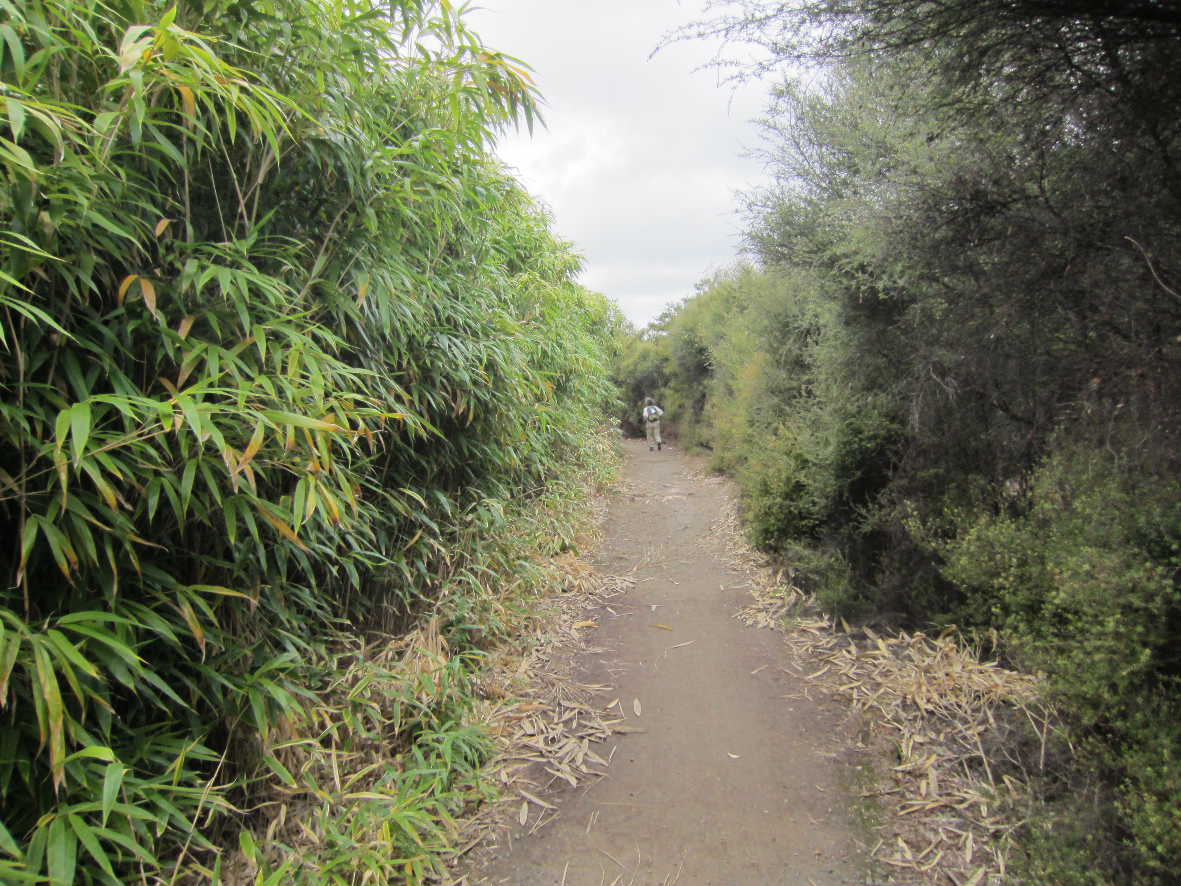 The path runs along a ridge of land that falls away sharply to the sea on both sides. The isthmus is never more than about two kilometres wide (not counting several headlands that jut out into Queen Charlotte Sound). Nowhere along this segment of the track is the bush untouched by human enterprise and intrusive species. In the valleys at the northern end broad tranches of land have been cleared for pasture. On the slopes of the isthmus and on neighbouring necks of land there are extensive pine plantations blotched by commercial felling. In places gorse and broom, with their bright yellow flowers, grow profusely on the trackside interrupted here and there by the purple of thistles and the streaked white of eyebright. In Queen Charlotte Sound and adjacent Kenepuru Sound mussells are farmed. They grow on ropes that stretch between floats arranged in rows across the surface of the water.